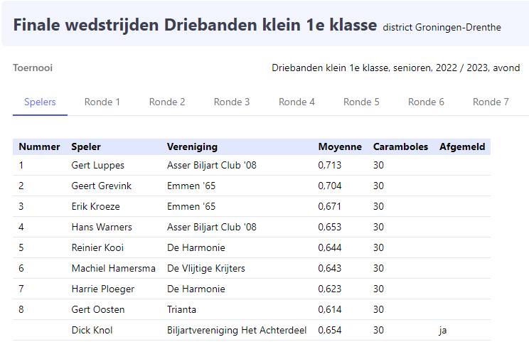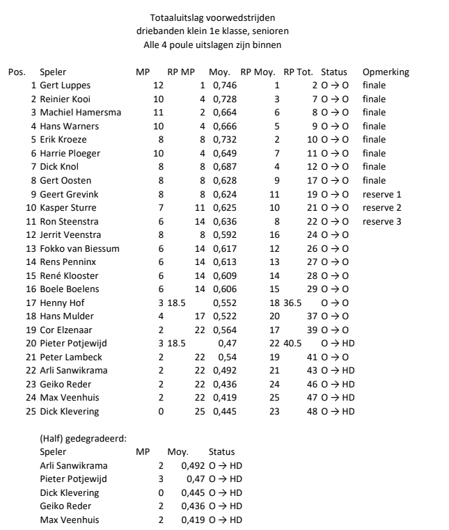 Van de 25 deelnemers in deze klasse eindigde Gert als 8e en daarmee mag hij weer deelnemen aan de districtsfinale Groningen-Drenthe, welke op 5 en 6 november gespeeld wordt bij Centrum 1977 aan de Protonstraat in Groningen.