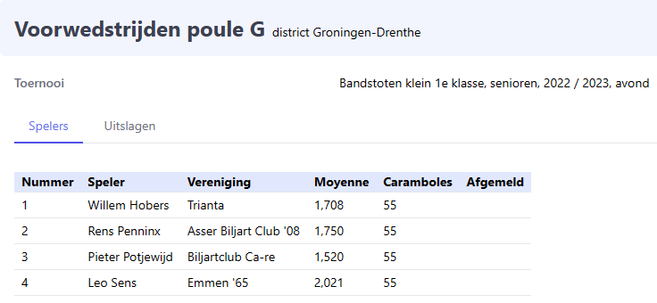 De wedstrijden worden georganiseerd door Trianta op 30 januari en 6 februari 2023 in de Bremstraat in Assen. In de poule G van deze klasse staan nog maar "slechts" 4 deelnemers. We nemen aan dat deze poule nog wel wordt aangevuld.