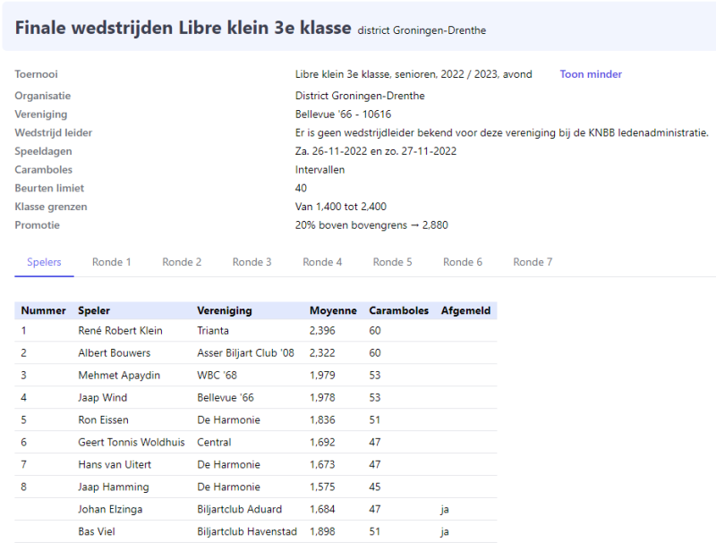 De finale wordt op 26 en 27 november bij biljartvereniging Bellevue in Assen gespeeld.
