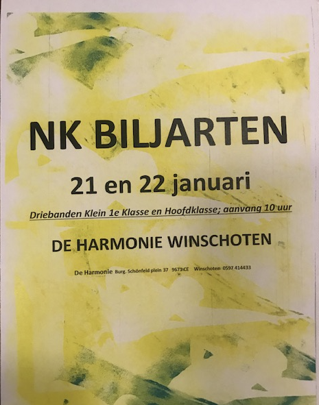 Het Nederlandse Kampioenschap zal plaatsvinden op 21 en 22 januari bij De Harmonie in Winschoten.