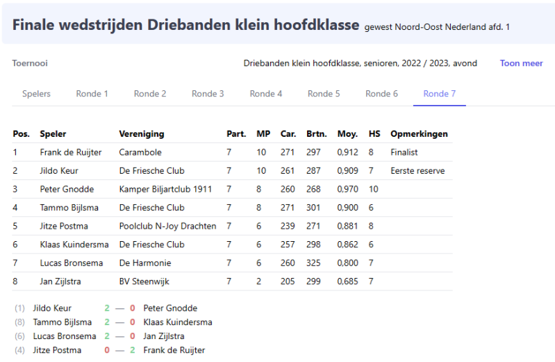 Tijdens de laatste wedstrijdronde speelde de nr. 1 van dat moment, Peter Gnodde tegen de nr. 3 van de ranglijst, Jildo Keur. Op een andere tafel speelde Frank de Ruijter, die na 6 gespeelde wedstrijden de 3e plaats bezette. Het trio had op dat moment alle drie 8 matchpunten. Keur won nipt van Gnodde de De Ruijter won van Jitze Postma, maar als Frank er 1 beurt meer had over gedaan, was Jildo keur met het kampioenschap gaan strijken. Slechts 3/1000 was het verschil tussen 1 en 2. Een waar spektakelstuk in de slotfase van een mooi toernooi. Bijzonder is dat Frank de Ruijter op de eerste wedstrijddag het toernooi begon met 2 nederlagen op rij. Daarna wist hij alles te winnen.