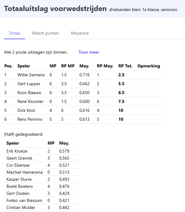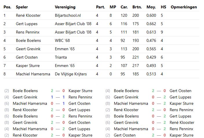 Dat is wat er voor de spelers te wachten staat voor de spelers in de beide poules van deze klasse. Ook Gert Oosten heeft zich op basis van de resultaten van het vorig seizoen kunnen handhaven en zal weer van goede huize moeten komen om dit niveau weer te kunnen halen.
