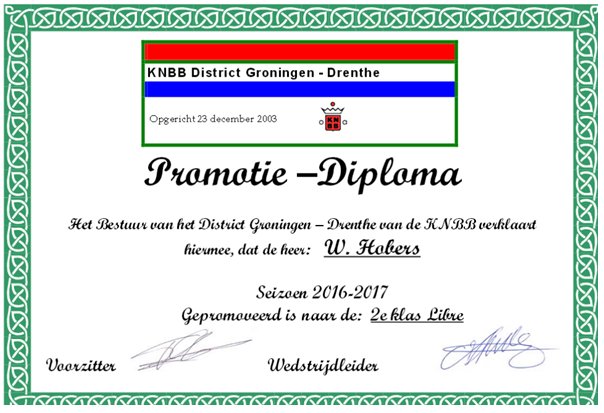 Voor deze promotie heeft Willen nu een diploma ontvangen. Een blijk van waardering van de KNBB voor de inzet die wordt verricht om te promoveren.