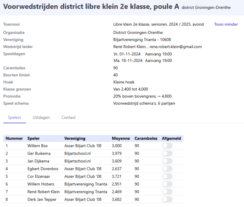 De wedstrijden worden georganiseerd door zijn eigen club Trianta. Volgens KNBB Live-score staan deze voor dinsdagen 19 en 26 november op de agenda van het wedstrijdenprogramma. Maar aan deze data kan nog enigszins worden gesleuteld.
