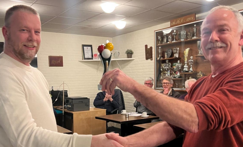 Sinds 2022 is Edwin lid van Trianta en zeker niet onverdienstelijk: hij werd tijdens deze ledenvergadering ook nog eens verrast met de titel Clubkampioen 2024. Uit handen van wedstrijdleider Vincent van Vilsteren ontving hij de bij deze overwinning behorende bokaal.