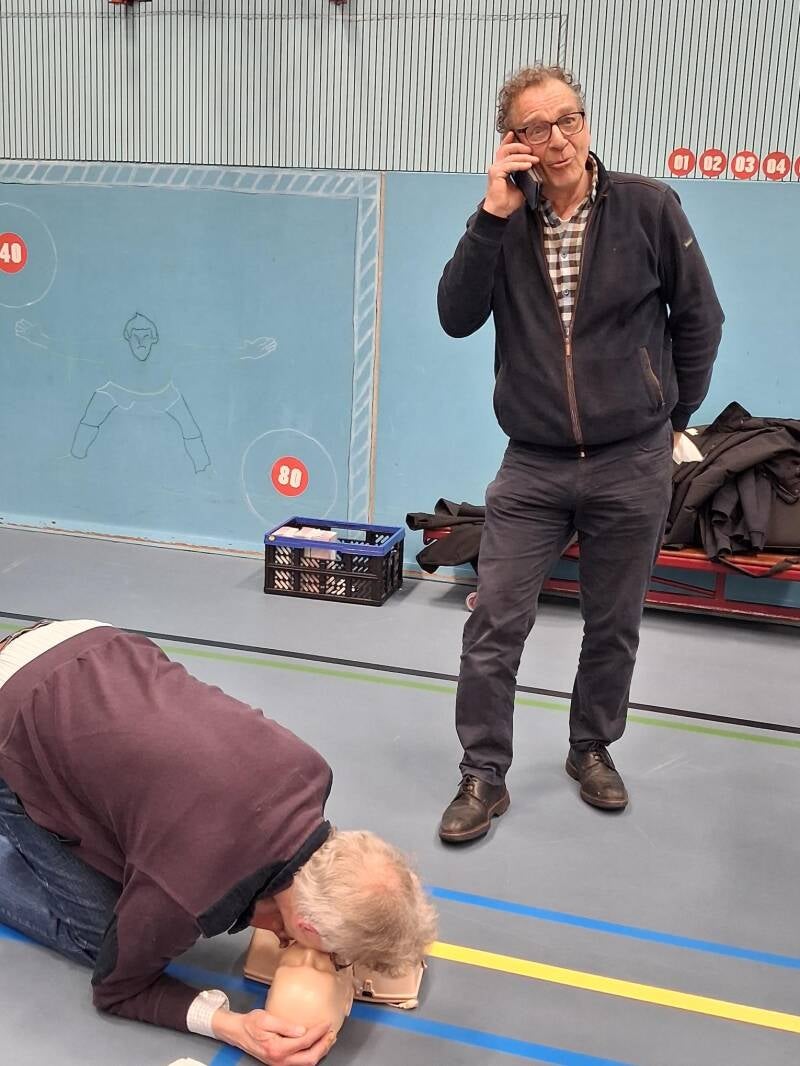 Op de foto is Maarten bezig met reanimeren terwijl Henk met 112 belt.